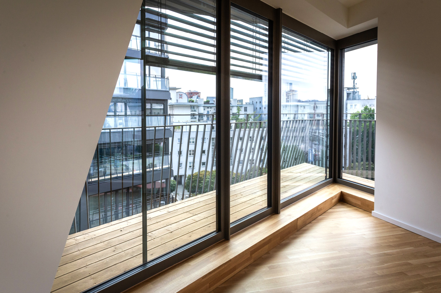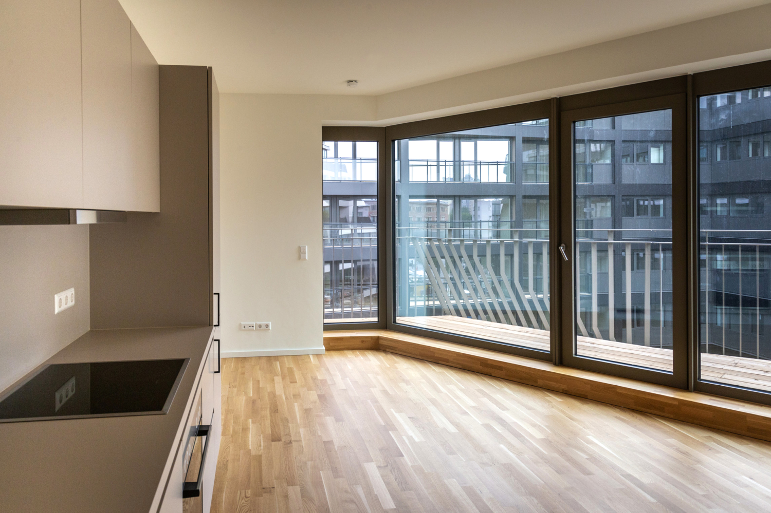 The apartments size L have 4 and 5 rooms and vary between 87 m² and 223 m². The apartments have a balcony or a loggia, and some are even duplex apartments. The quality of the architecture continues to shine inside, through floor plans that support the modern and individual lifestyle of today. Generous window facades, open-plan kitchens, and the bright and friendly furnishings of the bathrooms allow you to breathe and offer a high quality of life. We should not forget to mention that the apartments sizing M & L are equipped with fitted kitchens, high-quality oak wood parquet flooring, and some have utility rooms.